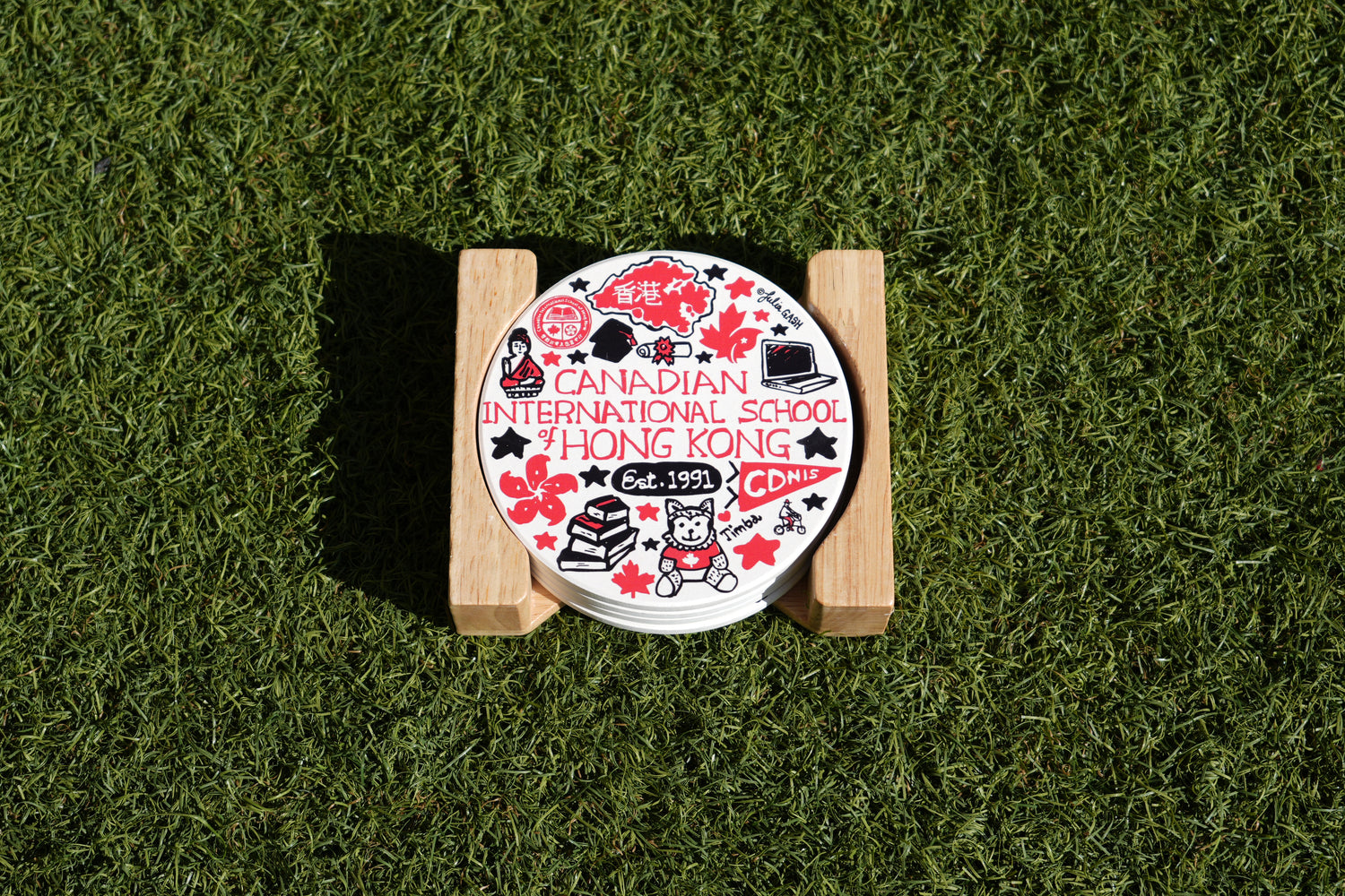 This 4 Pack Stone Coaster set features artwork from British Artist Julia Gash with CDNIS themed places and monuments of the CDNIS Campus. Paired with a wooden holder.