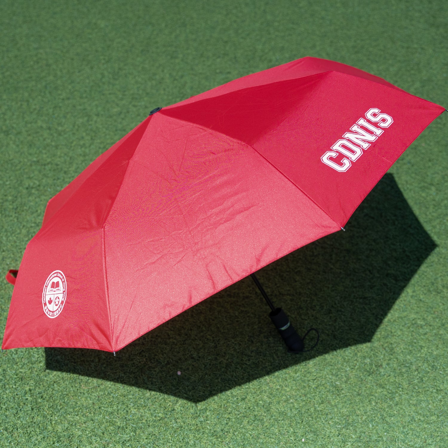 An automatic open and close foldable umbrella in CDNIS colours. Auto open and close -- one push of a button opens the umbrella, one push closes it keeping one hand free when you're on the go. Includes a convenient easy-carry wrist strap and wide tie strap for easy compact storage. Premium textured handle for a comfortable, secure grip with metallic look detailing that adds a stylish accent.